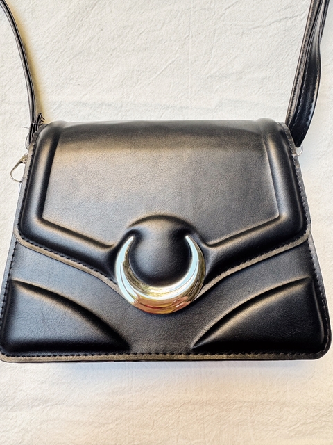 Cartera eco cuero negra con dije original. 17 cm de alto aprox y entra bien un celu grande